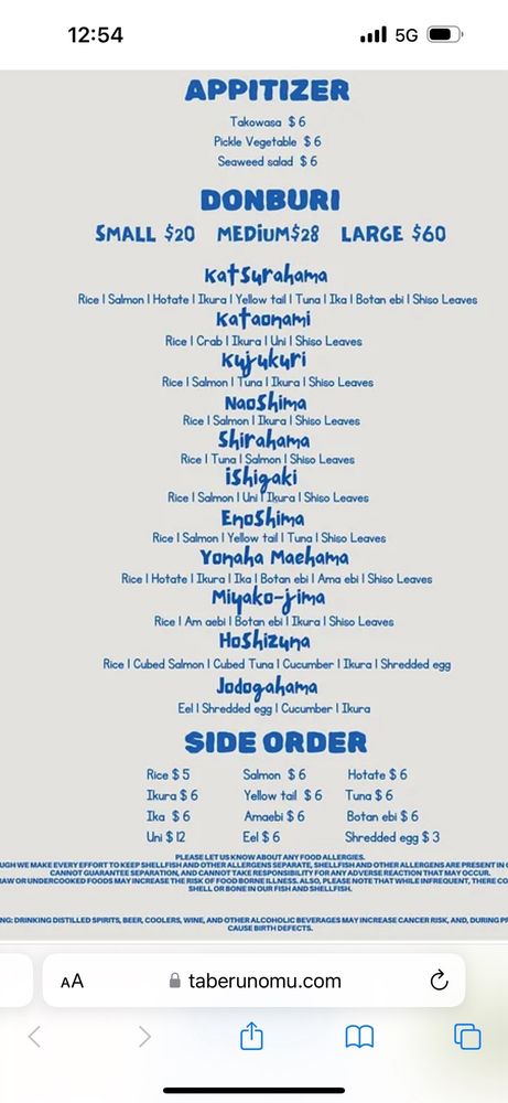 Welcome to Taberu Nomu, a captivating haven for seafood lovers nestled in the heart of New York City. Specializing in authentic Japanese cuisine, this restaurant promises a delightful journey through the ocean's bounty. The menu showcases a variety of exquisite donburi bowls, each offering a harmonious blend of fresh ingredients.